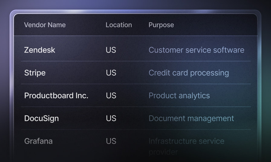 All vendors are assessed for security, privacy, and compliance. Those handling sensitive data must meet SOC 2.